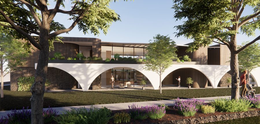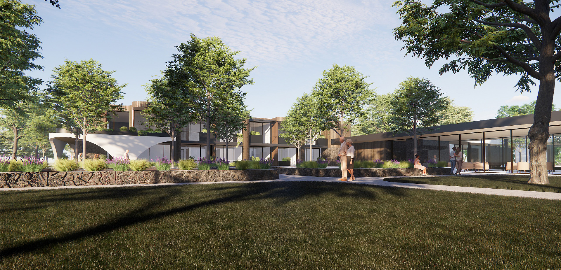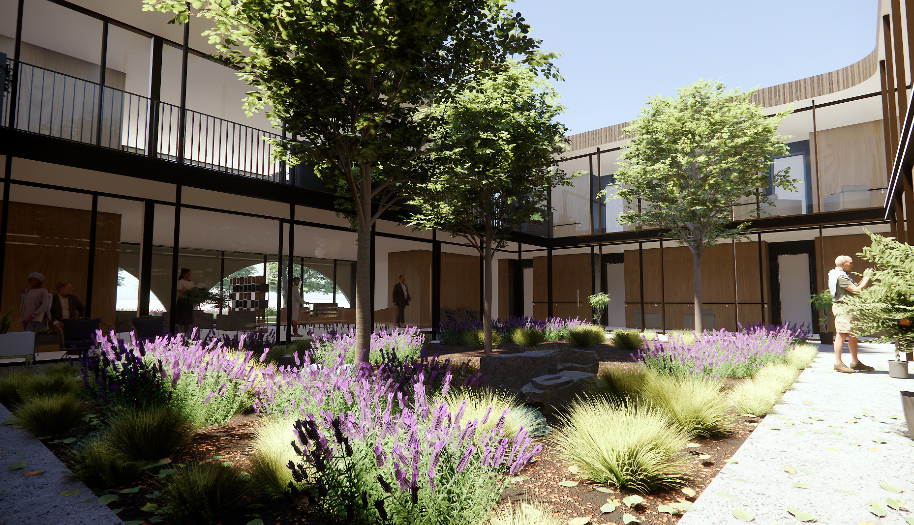 The interior design of the residential modules emphasise accessible movement throughout the common areas, with an abundance of natural light for the wellbeing of the residents. Screen walls provide sightlines to connect residents to nature from the exterior grounds, through the building and to an interior courtyard. The built form uses biophilic design principles, with the curvature and textures inspired by trees and leaves, further enhancing the connection to the local environment.
