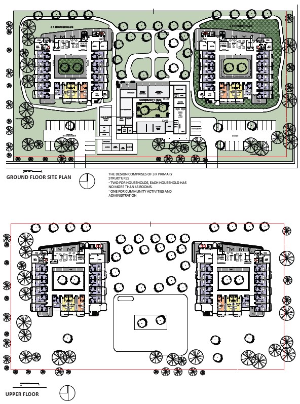 Hillam responded to this concept with a wonderful facility of three primary structures in a beautifully landscaped environment: a single-storey administration and community building, and a pair of two-storey residential buildings.