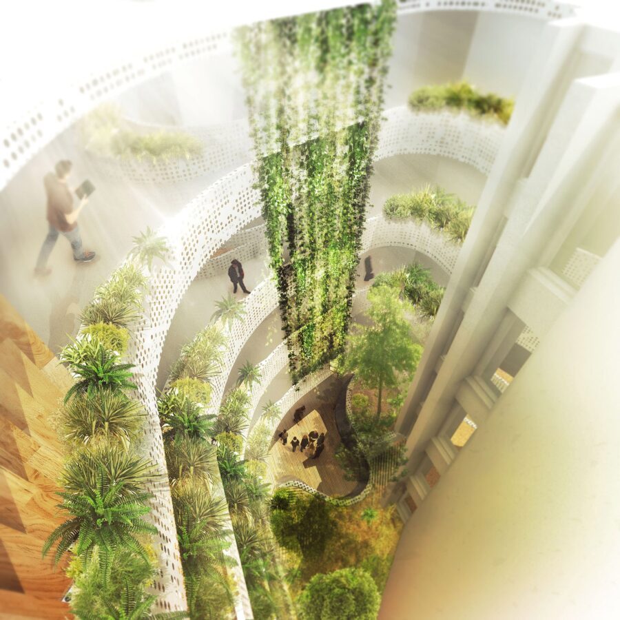This landscape will extend from the ground’s treed reflection space to 5 storeys; including continuous planters, providing a green feather edge and link bridges throughout. A vertical green trellis provides a green ribbon link from the ground to all the levels.