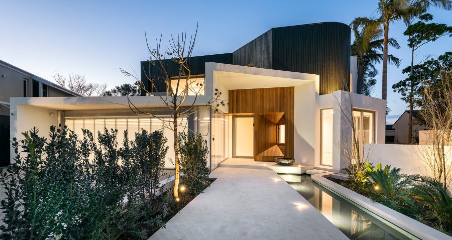 A new concrete canopy across the front elevation enhances the street presence of the residence while the reflection pool and stone tile path guide visitors to the entry, where a faceted timber window meets them at the front door.