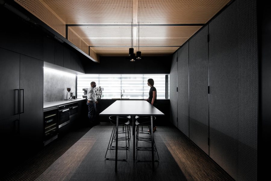 The restrained palette is predominantly timber, concrete and glass. The existing concrete slab, structure and services were left exposed and painted out, then paired with a directional lighting concept resulting in an interior that speaks of a dynamic, yet modern industrialist vibe.
