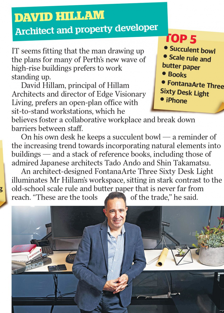 It seems fitting that the man drawing up the plans for many of Perth’s new wave of high-rise buildings prefers to work standing up.