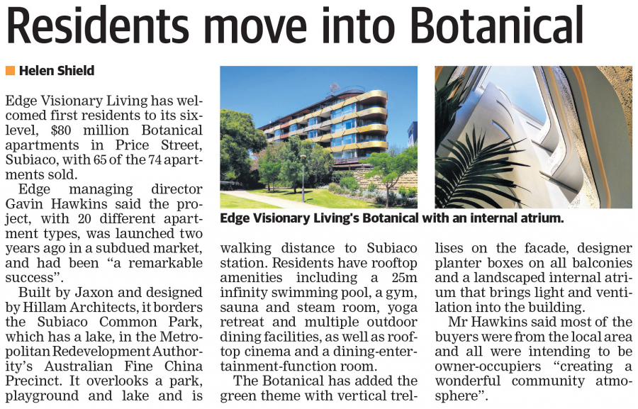 Edge Visionary Living has welcomed first residents to its six-level, $80 million Botanical apartments in Price Street, Subiaco, with 65 of the 74 apartments sold.
