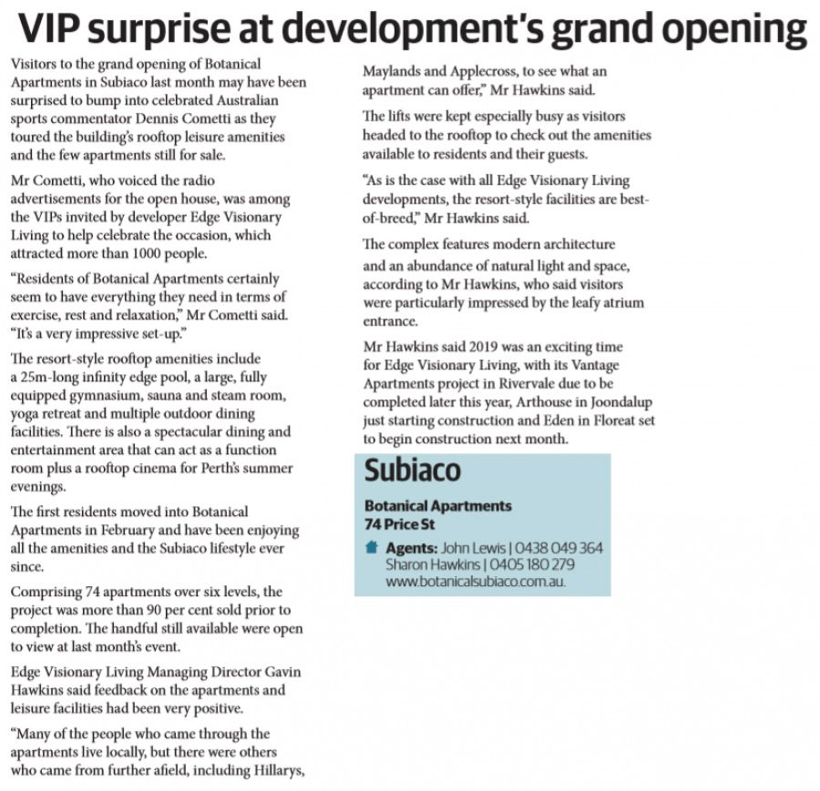 Visitors to the grand opening of Botanical Apartments in Subiaco last month may have been surprised to bump into celebrated Australian sports commentator Dennis Cometti as they toured the building’s rooftop leisure amenities and the few apartments still for sale.
