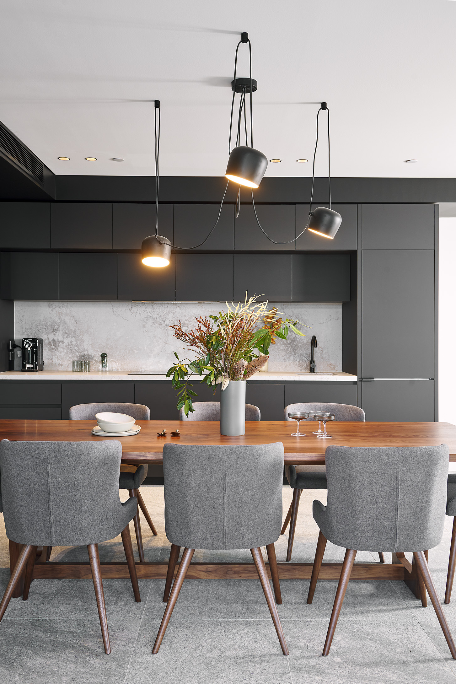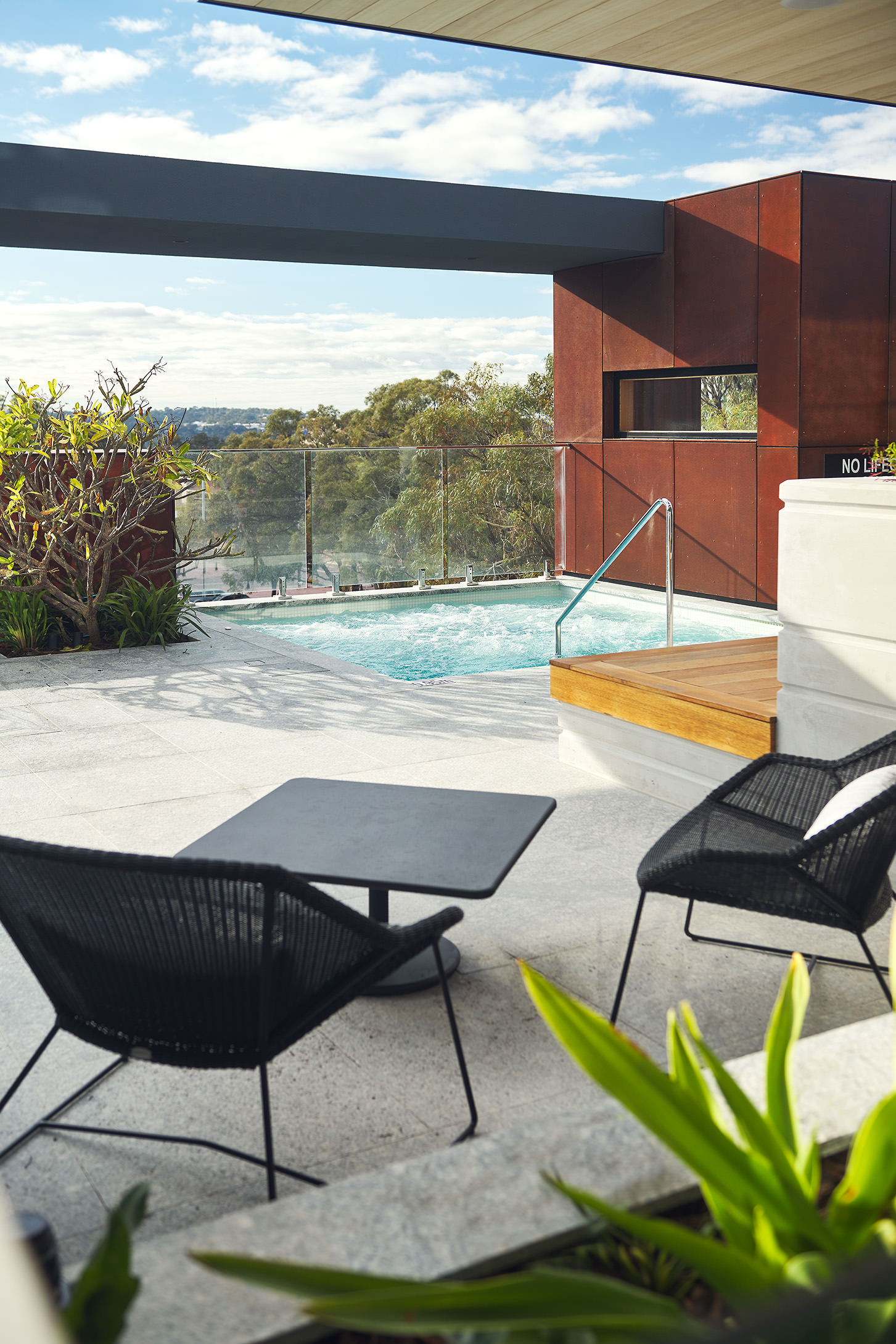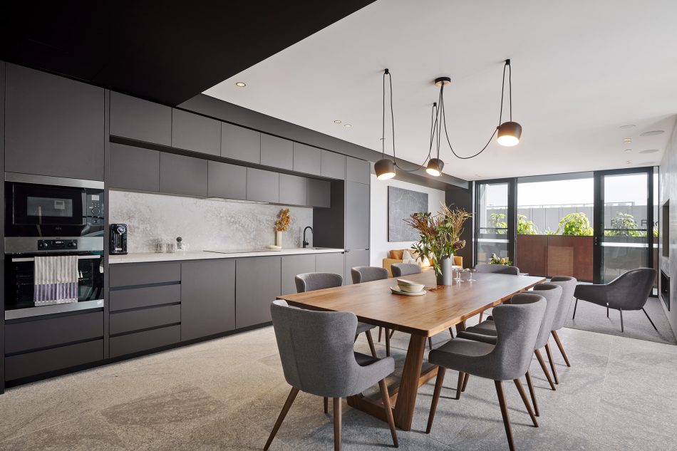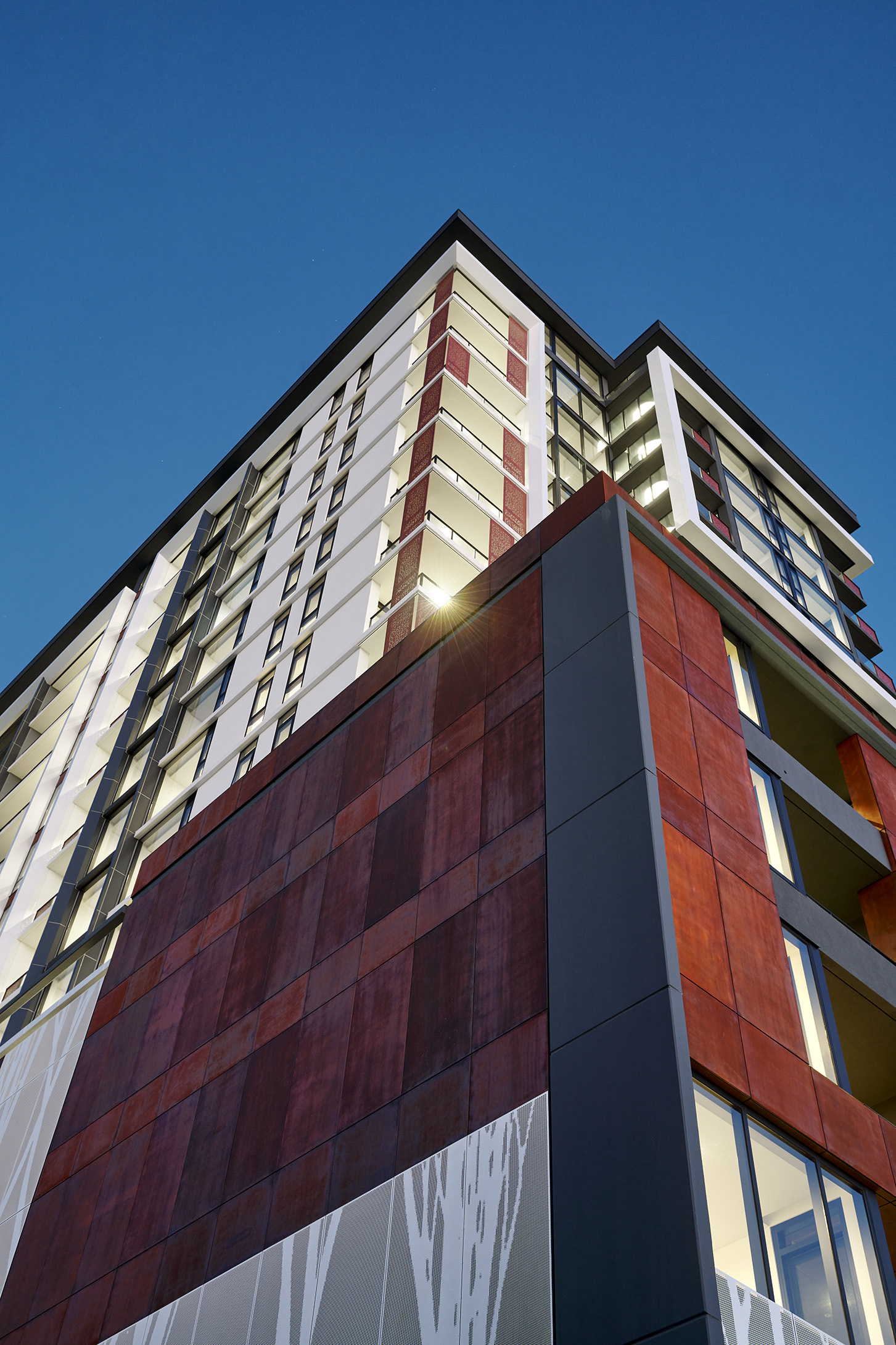 In keeping with Hillam Architects’ environmental philosophy, perforated metal screens protect the northern balconies, reducing heat-gain and encouraging indoor-outdoor living.