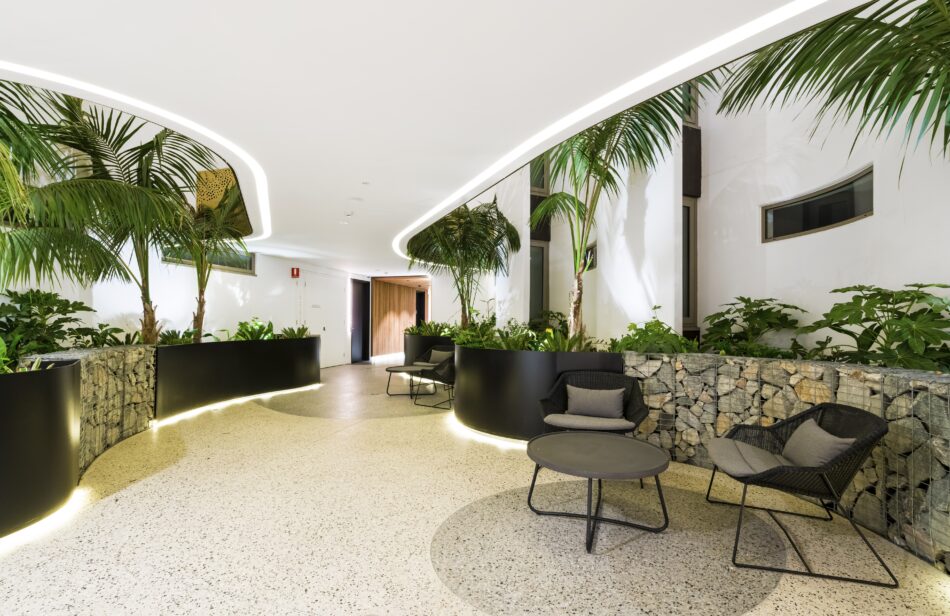 Botanical’s stunning five-storey atrium is bathed in natural light, literally bringing the outside in. The louvered roof allows air to circulate through the building interior, creating an internal sense of light, space and calm. On every floor, each apartment is connected with a sky bridge that includes reticulated planter boxes and cascading plants.