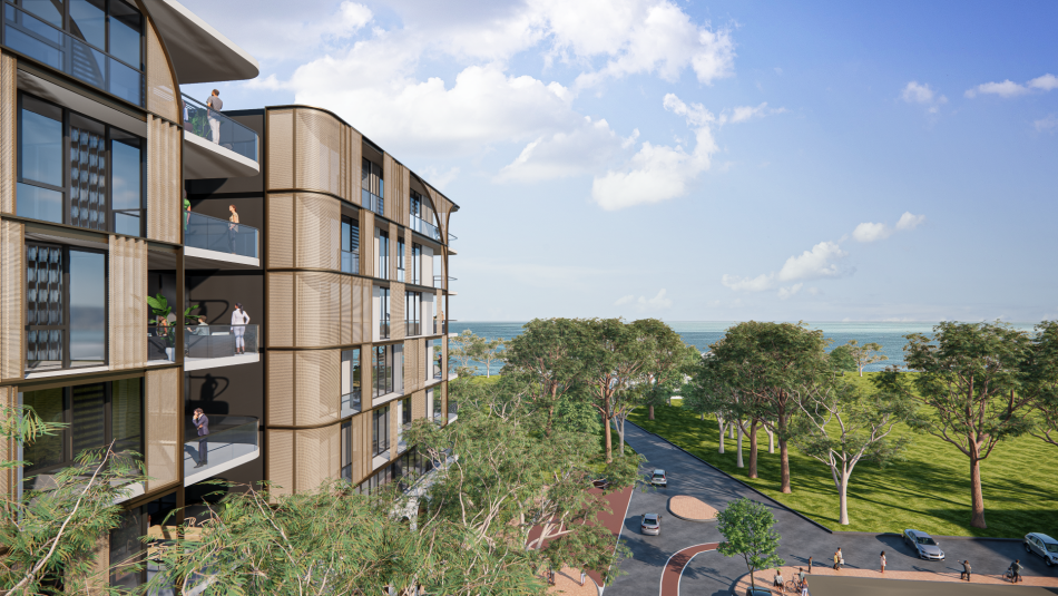 The upper levels consist of a dynamic envelope, a combination of glazed, solid and screen elements which work together to form a light appearance with subtle curves and details which reference the architecture below. The screens are a combination of fixed and moveable elements which give residents flexibility to adapt to the environment whilst still taking opportunity of the views. The expansive frontages to all apartments on dual sides affords 100% cross-ventilation.