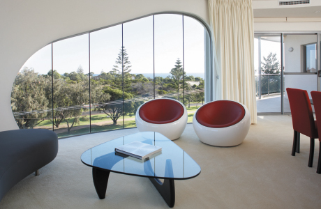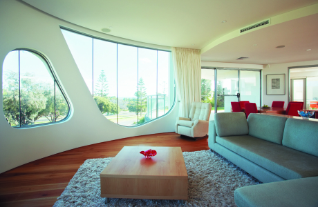 This theme was further developed with the extrusion of the interior form to create unusually-shaped, dramatically-sculptured windows. Internally, a muted material palette was chosen to reflect the colours and textures found in the nearby coastal scrub.