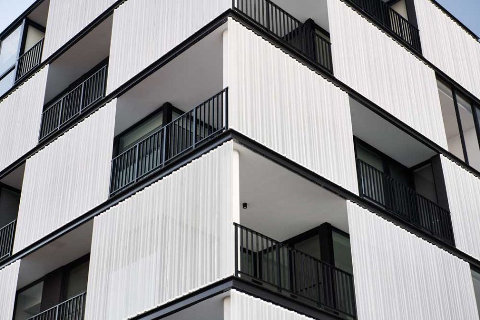 filtered through these screens, providing comfort to outdoor spaces and encouraging their use throughout the year. The unique, folding geometry of the screens negated the need for additional sub-structure and allowed the façade to appear light and delicate in appearance. These screens also curate views of the surrounding environment, framing and layering the outlook from each apartment.
