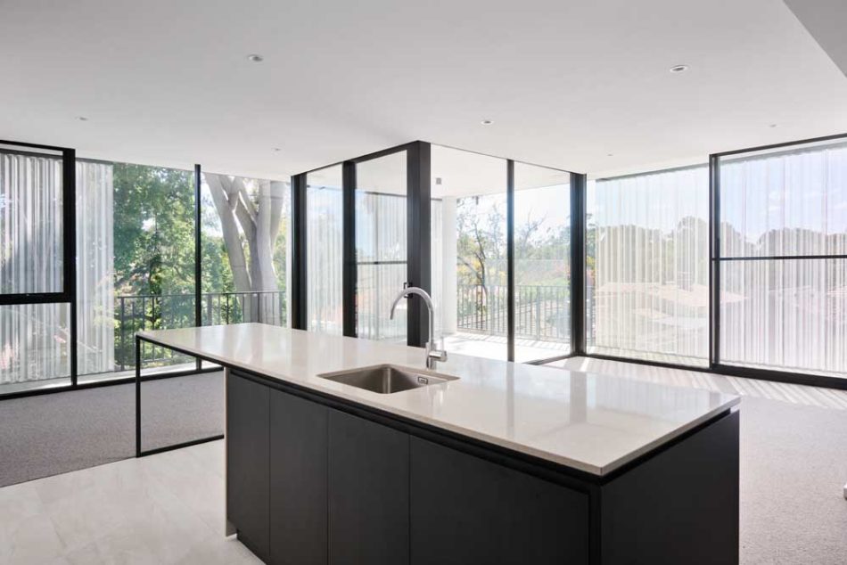 Through well-considered planning, the building is uncompromising in providing a high standard of living and wellness to residents. Apartments on all floors are orientated towards the northern aspect to allow for an abundance of natural daylight into dwellings. Residences on the east and western faces of the building are designed to take advantage of their dual aspect with living and dining areas flanking a generous corner balcony. Aging in place was also integral to the design philosophy of the building, apartments are equipped with wider doorways and larger bathrooms to ensure the development caters to a diverse range of future residents.