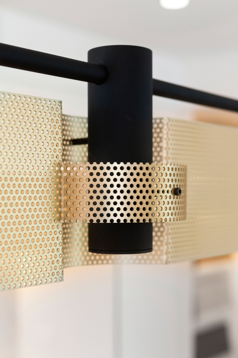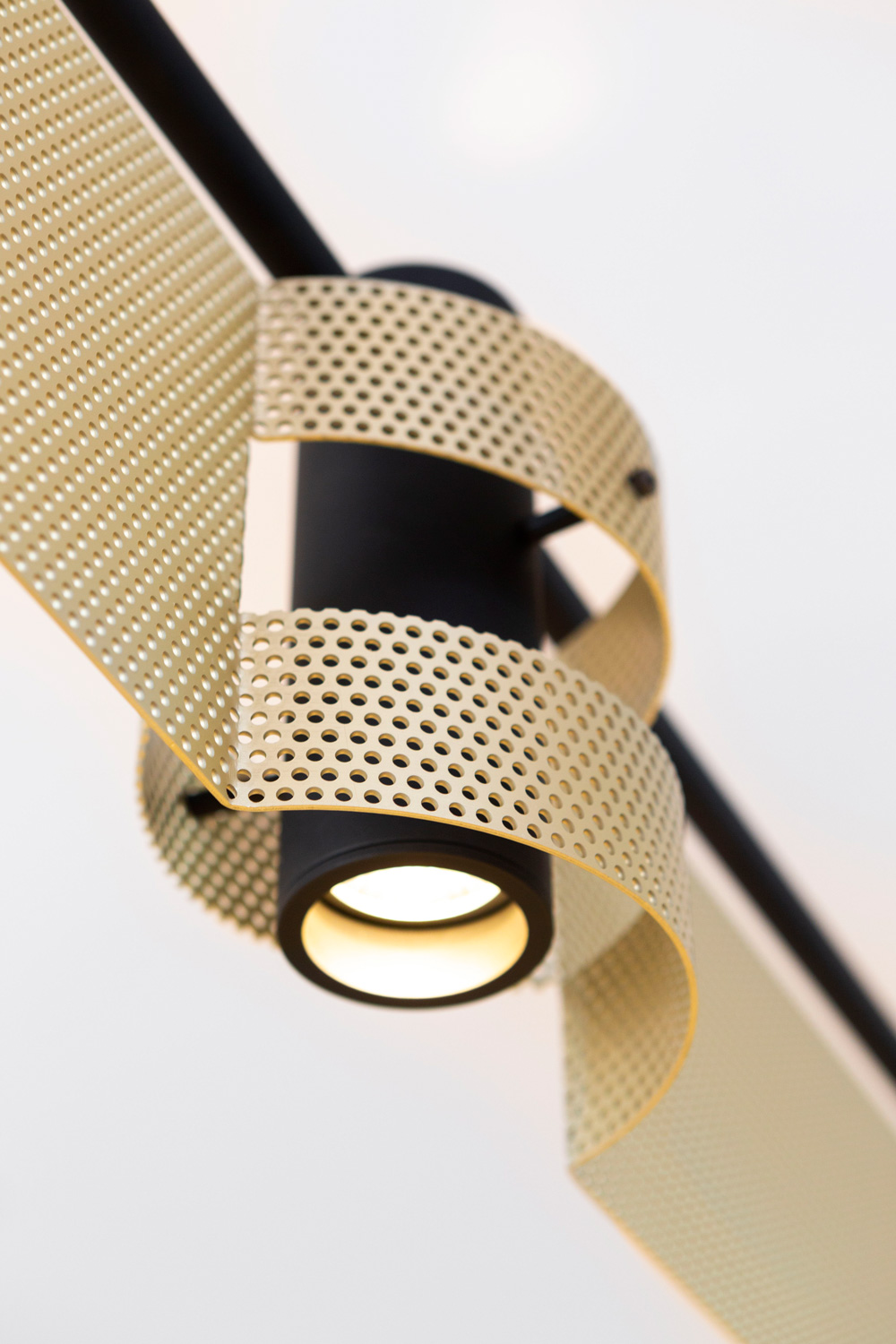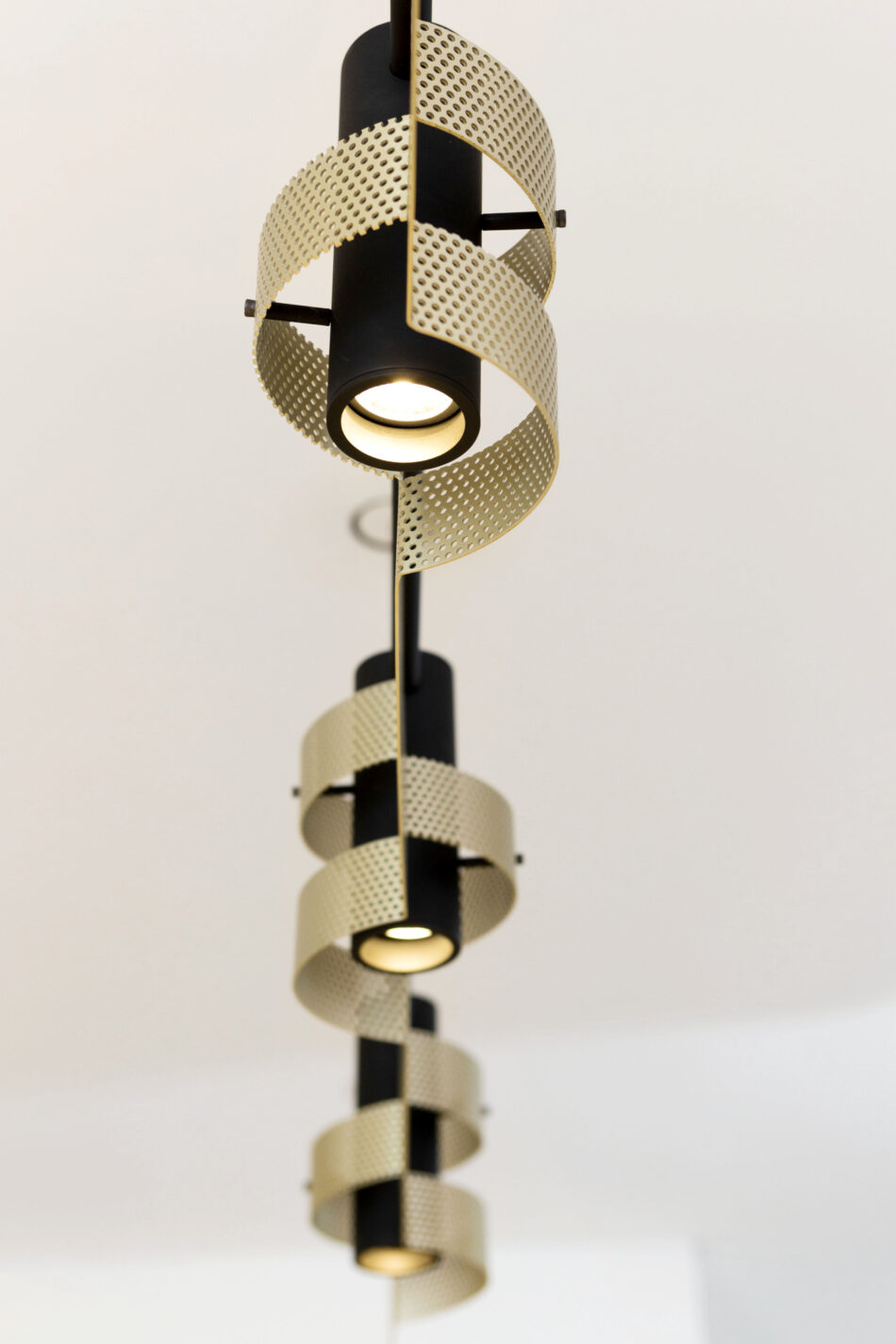 The lighting structure is simple in design, three black light canisters threaded onto a singular connecting rod. The single sheet of pressed metal is delicately attached to the canisters, creating an interesting juxtaposition between the structure and form. The pressed forms and perforations create varying material layers, as one moves around the pendant, the shape, transparency and light patterns change.