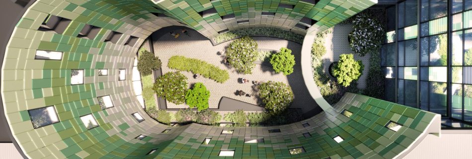 A beautiful internal courtyard inspired by the curved shapes of pottery moulds provides natural light to interior shared spaces.