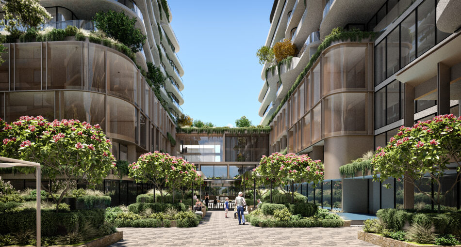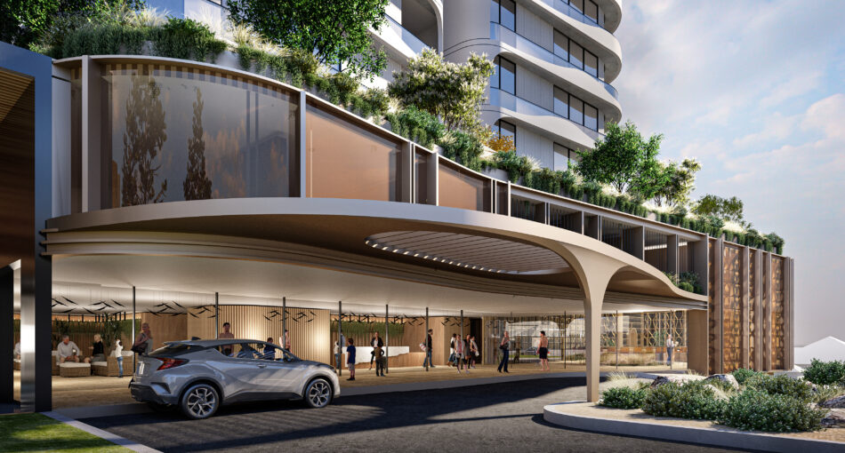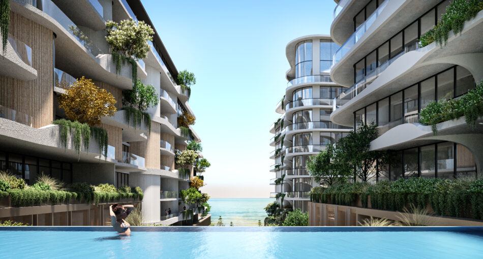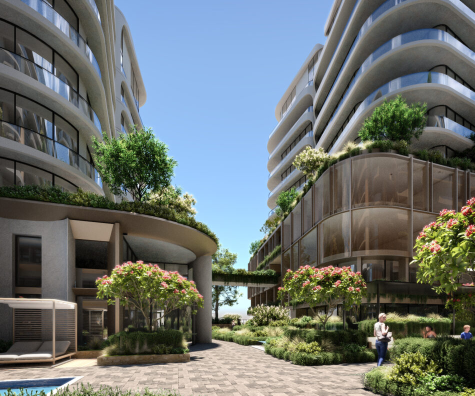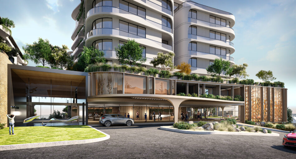The highly articulated building form is responsive and sympathetic to its surroundings and incorporates significant setbacks with extensive landscaping. The organic forms and highly considered configuration of the residential and hotel component allows for key view corridors to the ocean for residents where the design offers a community of buildings, each reflecting its own unique personality and character, adding to the diversity of the development and its surroundings.