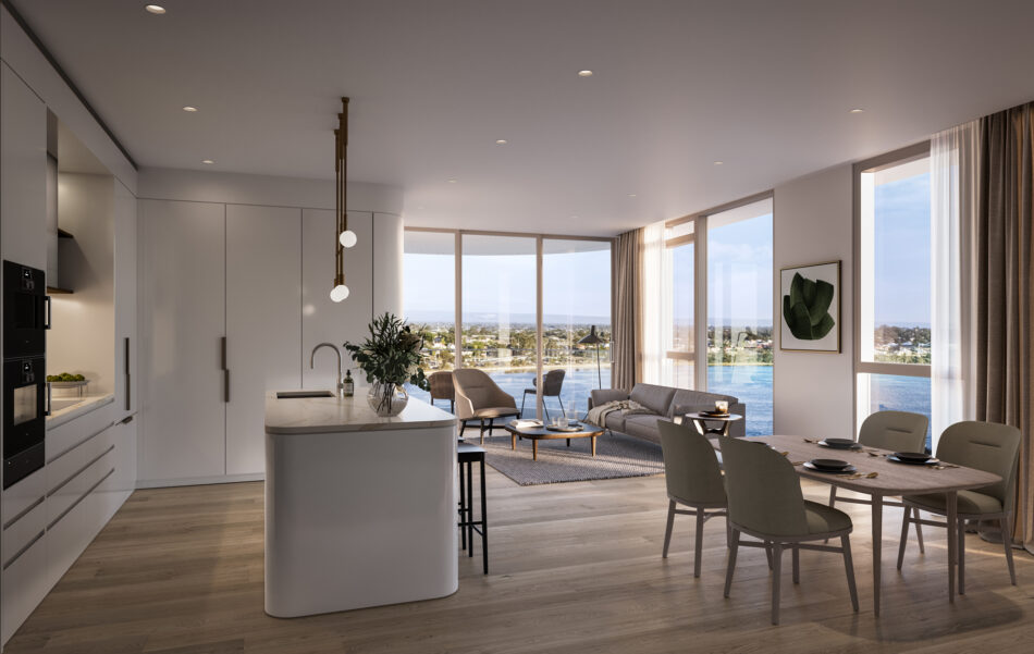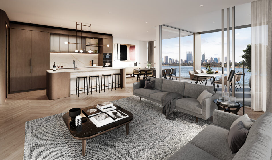 The design consists of 3 individual buildings comprising 217 premium apartments with a shared podium, central community space and extensive landscaping creating a much-loved residential address and riverfront visitor hub. The three-building project is superbly positioned on the foreshore in the prestigious riverside suburb of Applecross. Rivière’s collection of unparalleled luxury residences will offer sweeping, forever views across the Swan River to Perth City, Kings Park and the Darling Scarp.