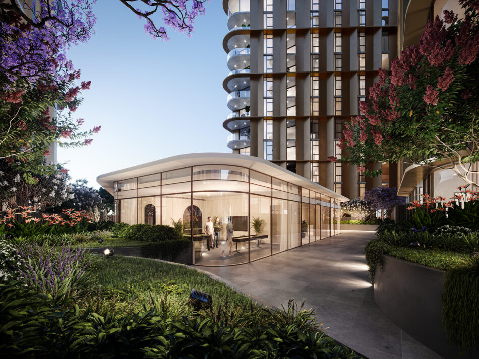 The organically shaped towers have been designed to promote view corridors through the site while reducing the perceived bulk of the towers. This has been achieved by stepping sections of each tower and curving all corners to soften the massing. Delicate horizontal and vertical framing around each tower provides further modulation while also providing privacy for residents and neighbouring properties.