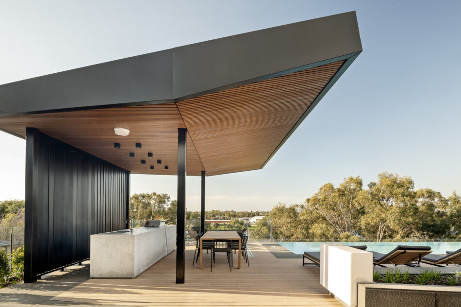 One of the building’s most attractive features is the rooftop terrace with zones for relaxing and entertaining defined by warm timber decking, flexible seating and manicured garden elements. There’s a furnished lounge, a herb garden, a barbecue area and even an outdoor cinema for movies under the stars.