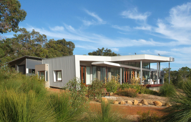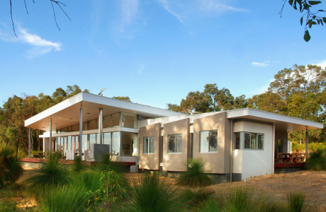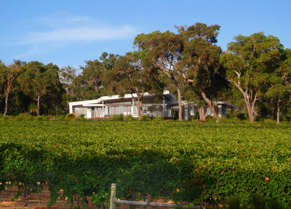 This modern Quindalup family home is close to the popular south-western coastal town of Yallingup. It’s perched on a ridge overlooking a vineyard, rugged natural bushland and with stunning views of nearby Geographe Bay.
