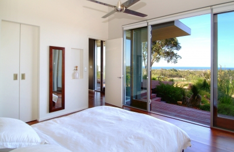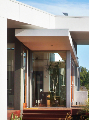 High ceilings and strategically-placed louvered windows capture the south-westerly sea breeze and allow natural ventilation to cool the house in summer. Extensive roof overhangs and existing mature trees reduce the heat load to the eastern and western facades.