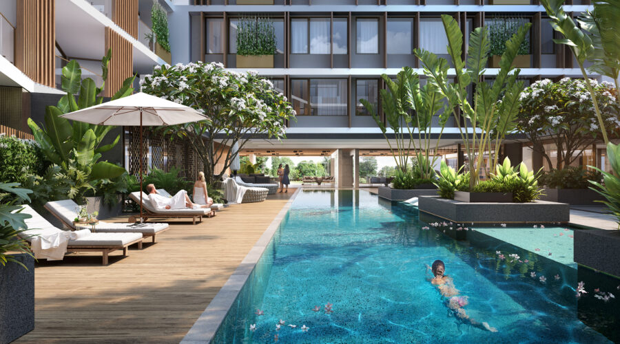 Dappled light from the landscaped gardens will dominate the surfaces throughout the resort-style amenities which include a 25m pool, viewing deck, gym and entertaining areas. Ponds and waterways have been designed into the circulation and transitional spaces to add further depth to the outdoor spaces.
